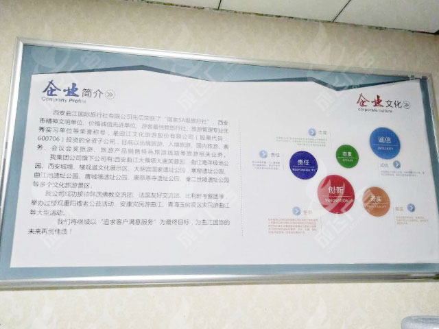 西安曲江国际旅行社成立于2009年12月11日,公司总部地处曲江文化产业开发区核心地带,是曲江文化旅游(集团)公司下属全资子公司,注册资金300万元人民币。公司目前以入境旅游、国内旅游为主营业务,同时兼营会议会奖旅游、旅游产品销售等旅游相关业务。 公司下设入境欧美部、入境港澳台东南亚部、入境日韩部、中国公民旅游销售部、计划部、会议会奖部、门市管理部、网络旅游部等十余个业务部门。